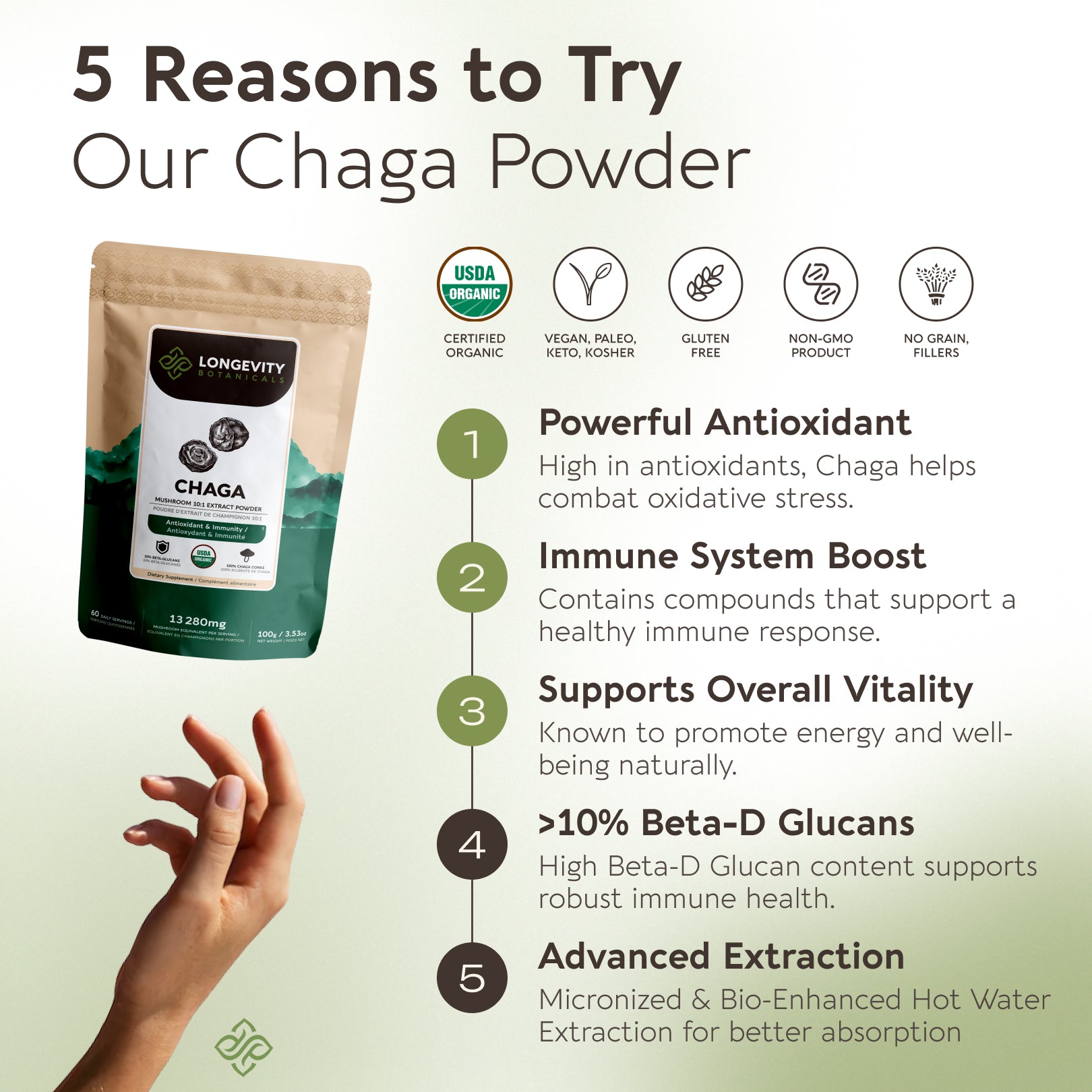 The antioxidants in Chaga are known for their potential to help protect cells from oxidative stress, supporting healthy aging and long-term vitality.