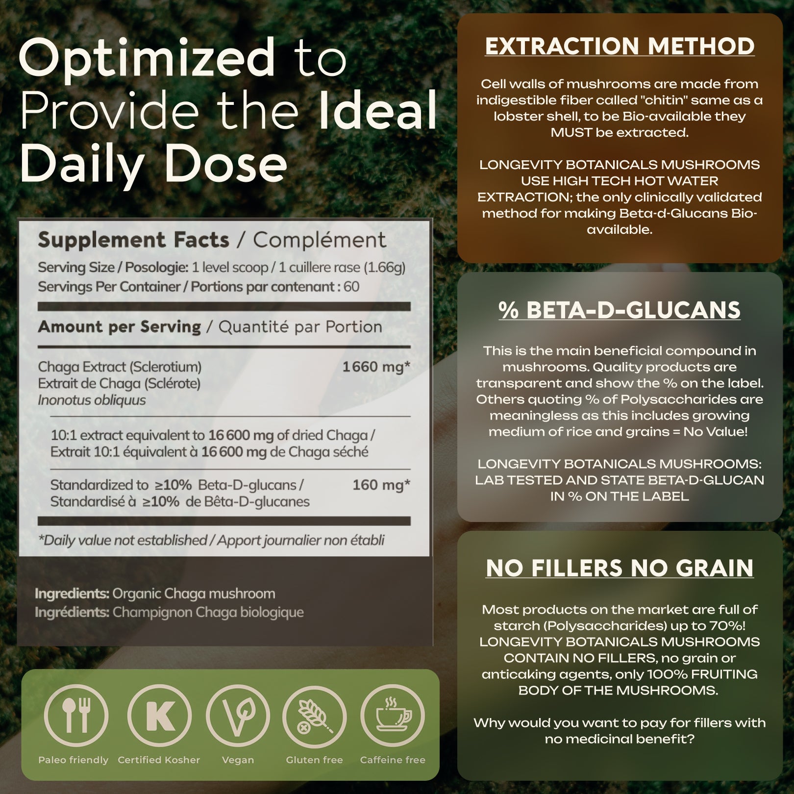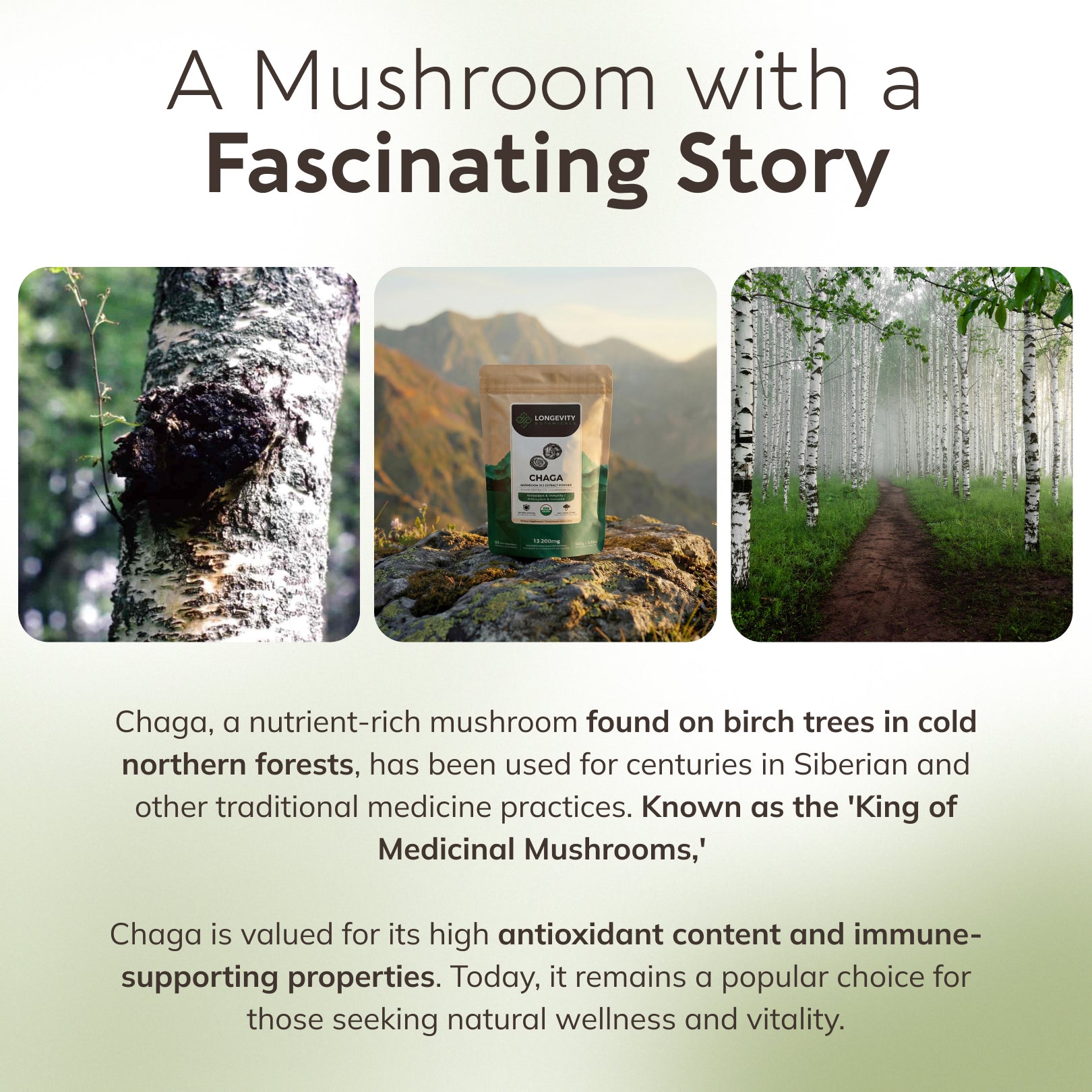 For centuries, Chaga mushrooms have been harvested from birch trees by Siberian and Northern cultures for their traditional use in supporting overall immunity. Rich in key active ingredients like Beta-D glucans, betulinic acid, polysaccharides, and melanin, It is valued for its potential antioxidant properties, helping to promote overall health and support well-being.
