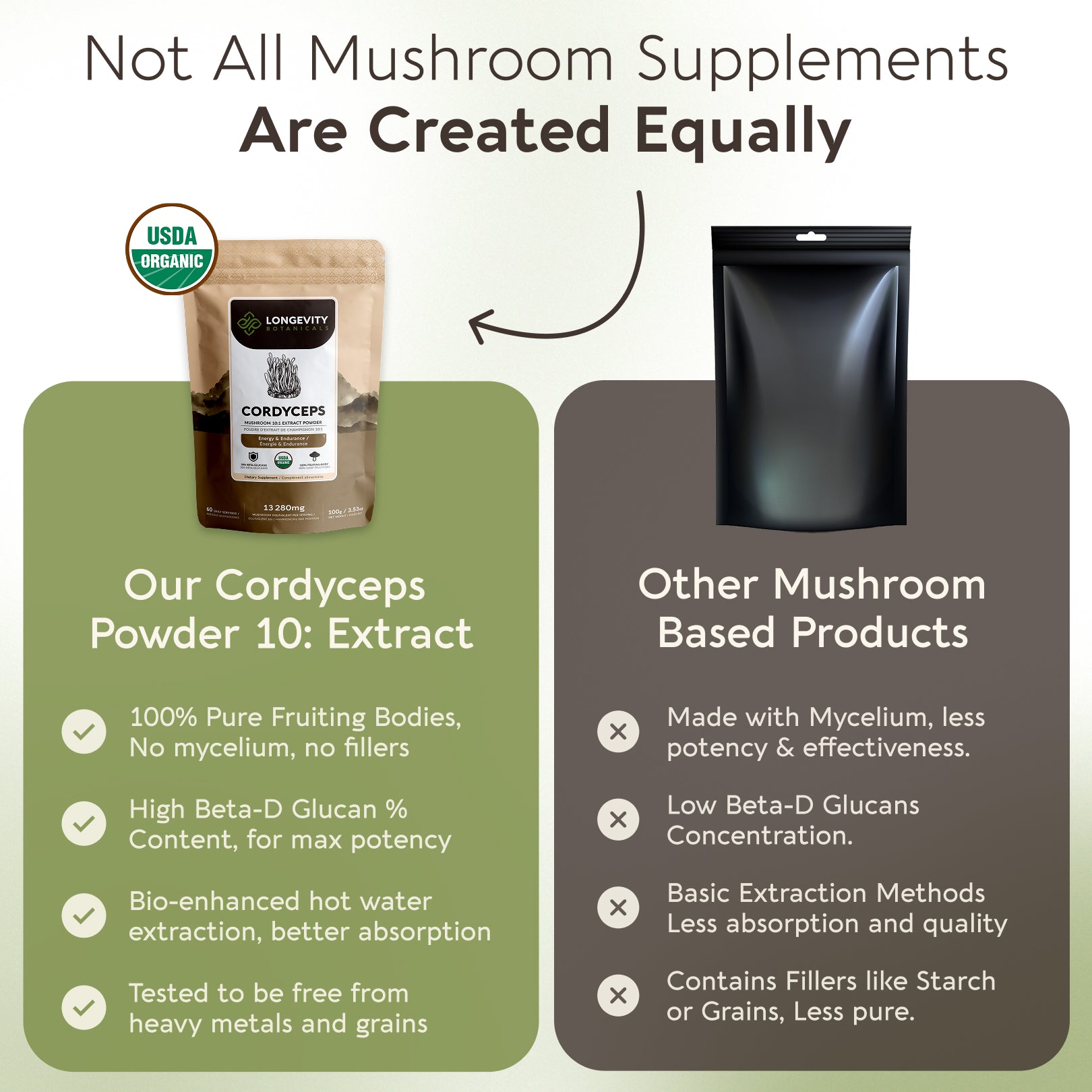 With 1,600 mg of pure Cordyceps mushroom fruiting bodies per serving, our extract provides a powerful and concentrated source of Beta-D glucans and cordycepin, known for their role in supporting energy production and endurance. Fruiting bodies contain more active compounds than mycelium, ensuring you receive a premium-quality supplement to help enhance vitality and support performance. Incorporate it into your daily routine to experience the potential benefits of this potent superfood.